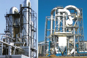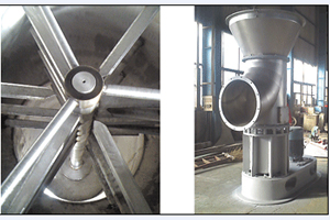 底部強化器設(shè)計獨特,攪拌齒為菱形,其流線性能使風阻達到低,設(shè)置在圓錐形料斗內(nèi),分動刀和定刀,粉碎效果顯著,使下落的結(jié)塊物料迅速粉碎為適合氣流干燥的粉粒料,攪拌的另一個主要作用是分散物料,加大了與料斗下面進來的高速熱風的接觸面積,于是料斗區(qū)形成了一個強烈傳熱傳質(zhì)的流化床,大部分濕分在料斗區(qū)燥。隨著干燥的進行,變輕變細的干料受氣流作用明顯,與氣流一起上升并進一步干燥,然后從干燥塔頂部出來進入物料收集系統(tǒng)。